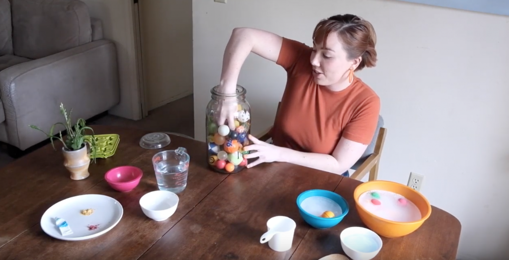 1. Put non-choking hazard toys in different size bowls. Then pour water over them.