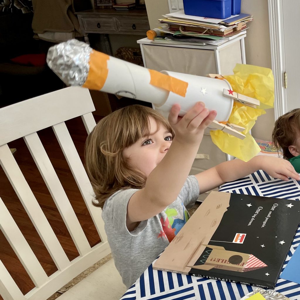 5. Play with the rocket. Once finished assembling your rocket, play with it together – maybe a gentle rocket launch with pillows or outside on the grass. Also encourage your early learner to